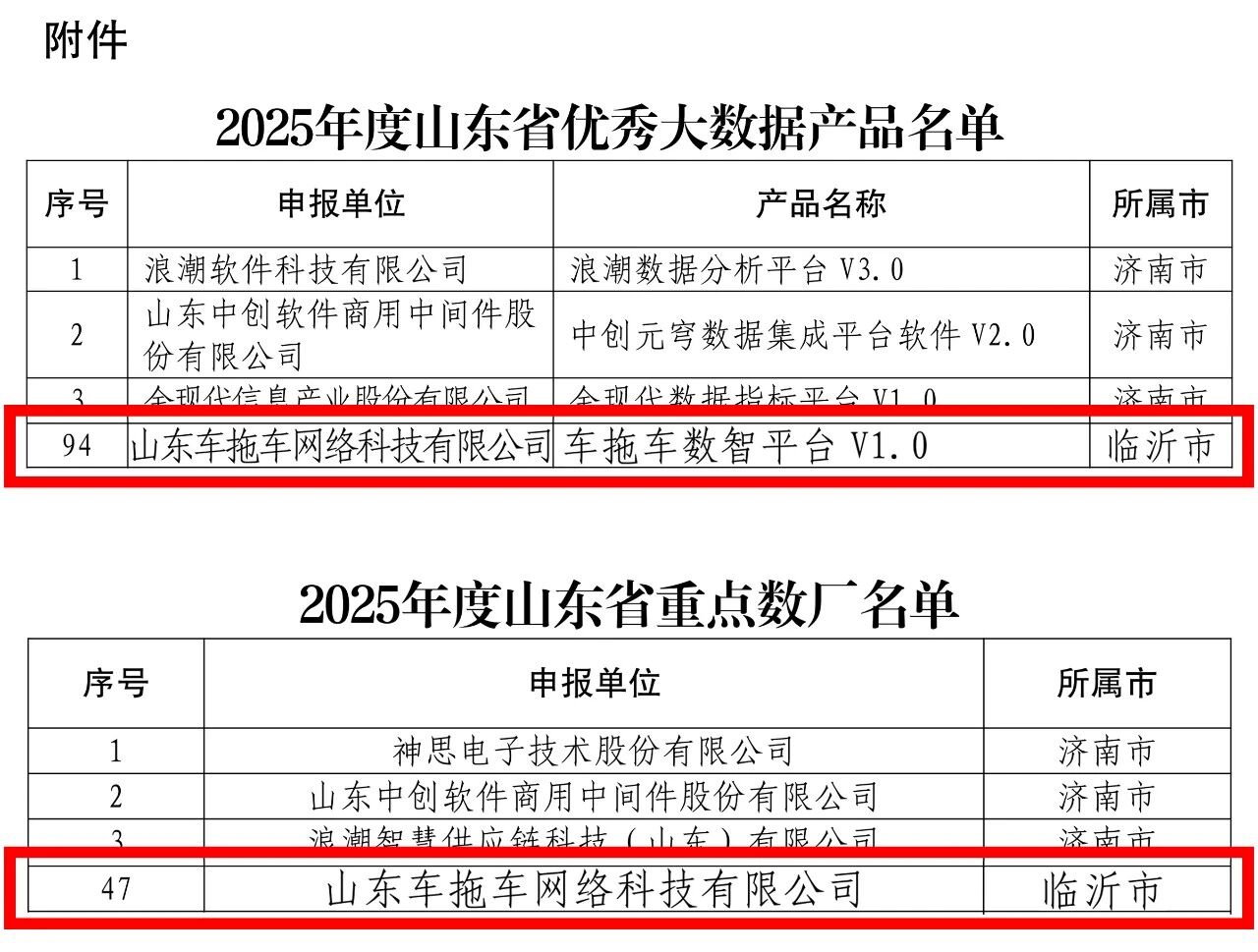 山东车拖车网络科技有限公司凭借硬核技术实力与创新应用成果,成功入选“2025年度山东省优秀大数据产品名单”与“2025年度山东省重点数厂名单”。