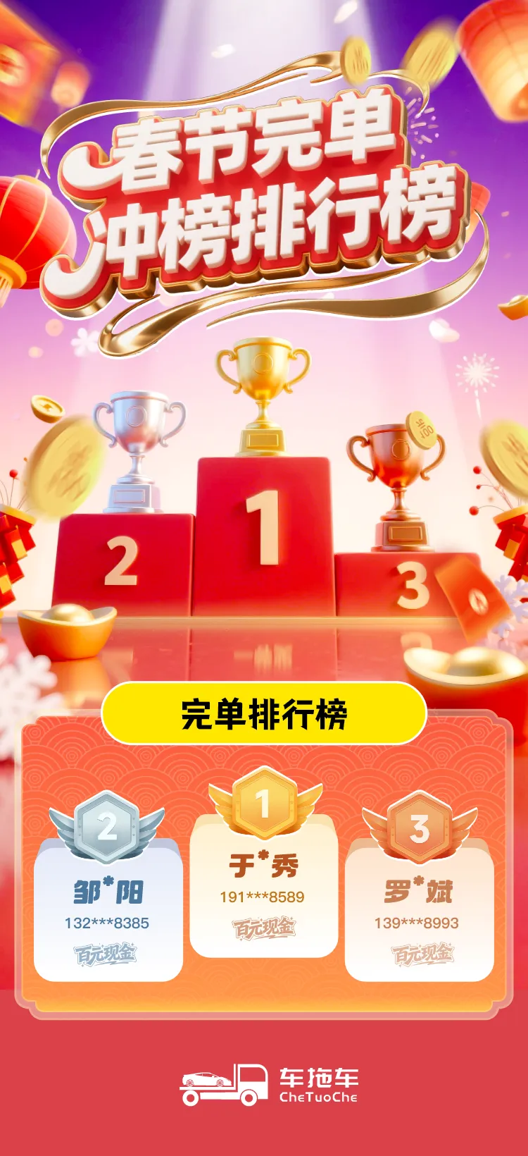 新春佳节期间,我们通过“车拖车APP”为大家准备了丰富多彩的运车互动活动,现已圆满落幕!所有专属奖励均已陆续发放至账户,请注意查收。