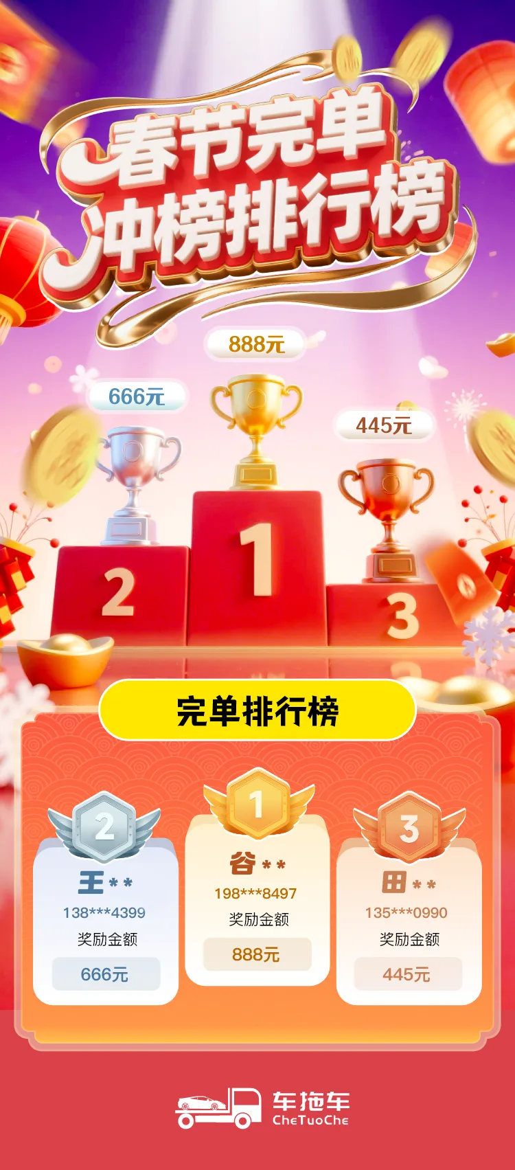 基于春节活动期间在平台贡献的交易金额,前三名发放现金奖励。一边接单赚钱,一边冲榜赢现金,两份收入轻松到手!