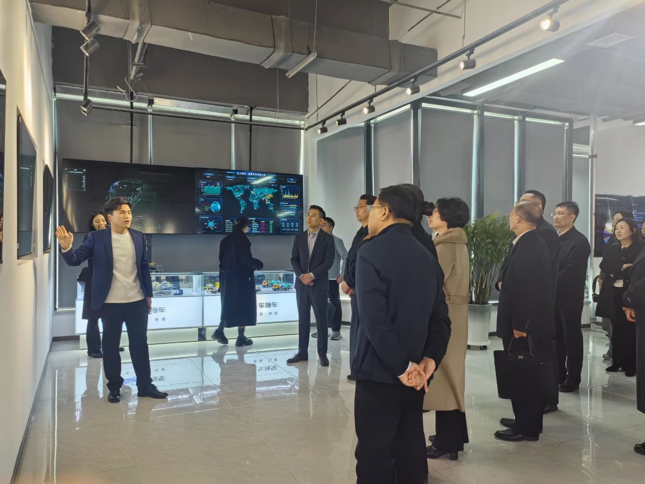 在联合创始人陈程的带领下,领导一行先后参观了公司的科技展厅、研发中心、品牌荣誉墙等地。陈总详细介绍了我司的发展战略、业务布局及未来发展愿景,重点展示了公司在数智化物流领域的科技创新成果。肖永涛对我司在技术创新和产品研发方面取得的成绩表示高度的肯定和赞赏,并指出:“这些成果充分体现了车拖车在行业内的领先地位,也为全国汽车运输服务行业的高质量发展树立了标杆。”