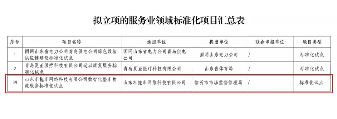 山东省市场监督管理局发布《关于拟下达省级标准化项目的公示》,山东车拖车网络科技有限公司申报的“数智化整车物流服务标准化试点”成功入选山东省省级服务业领域标准化试点项目